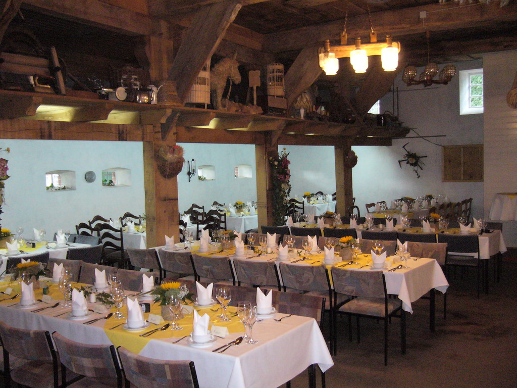 Unsere 150 qm große Diele bietet genügend Platz für Gesellschaften von 120 bis 150 Personen. Sollte Ihre Feier größer sein, ist die Diele mit dem Hofladen und dem einem weiteren Raum zu kombinieren und ihre Gästeliste kann 200-250 Personen zählen.